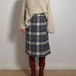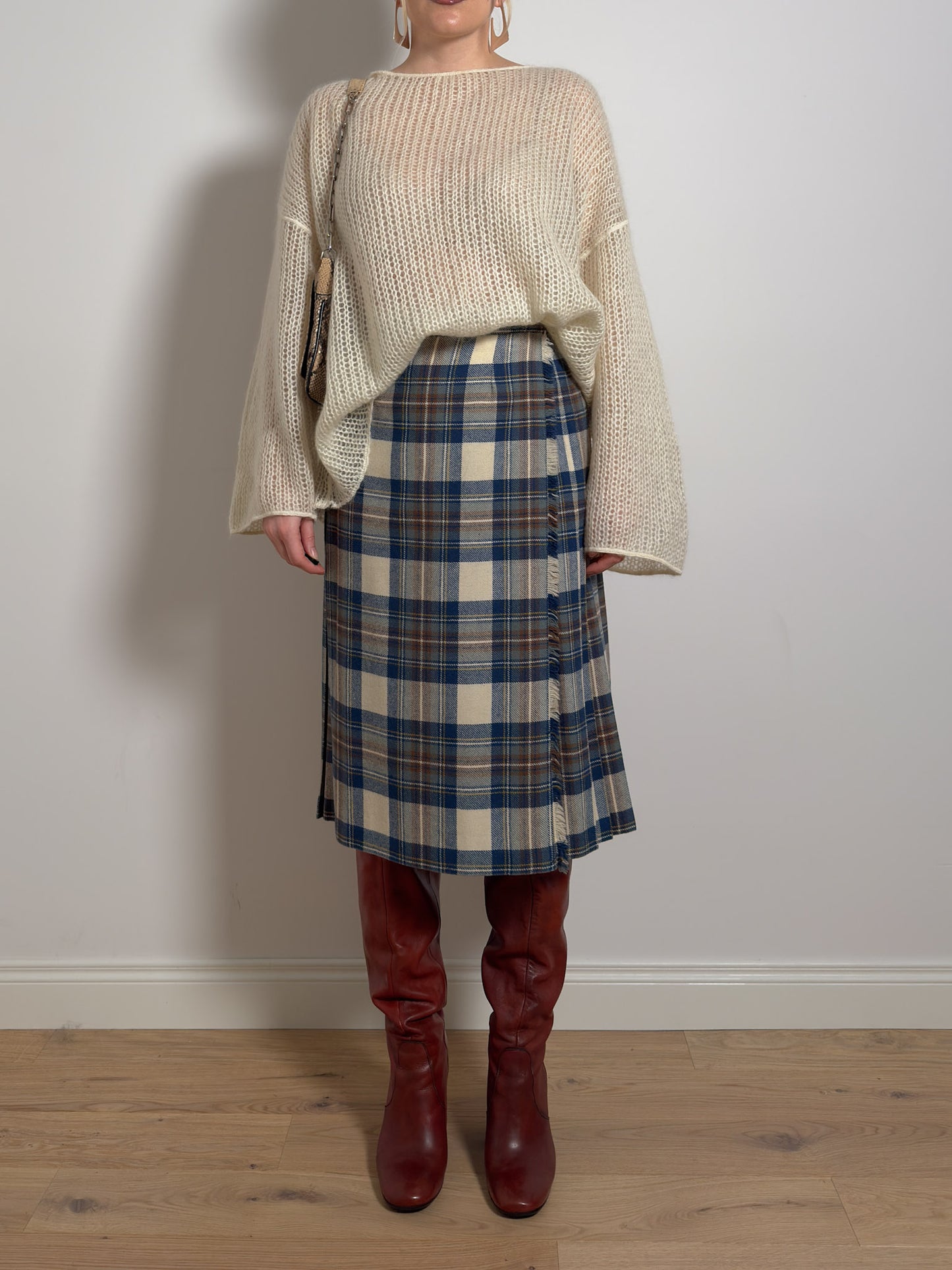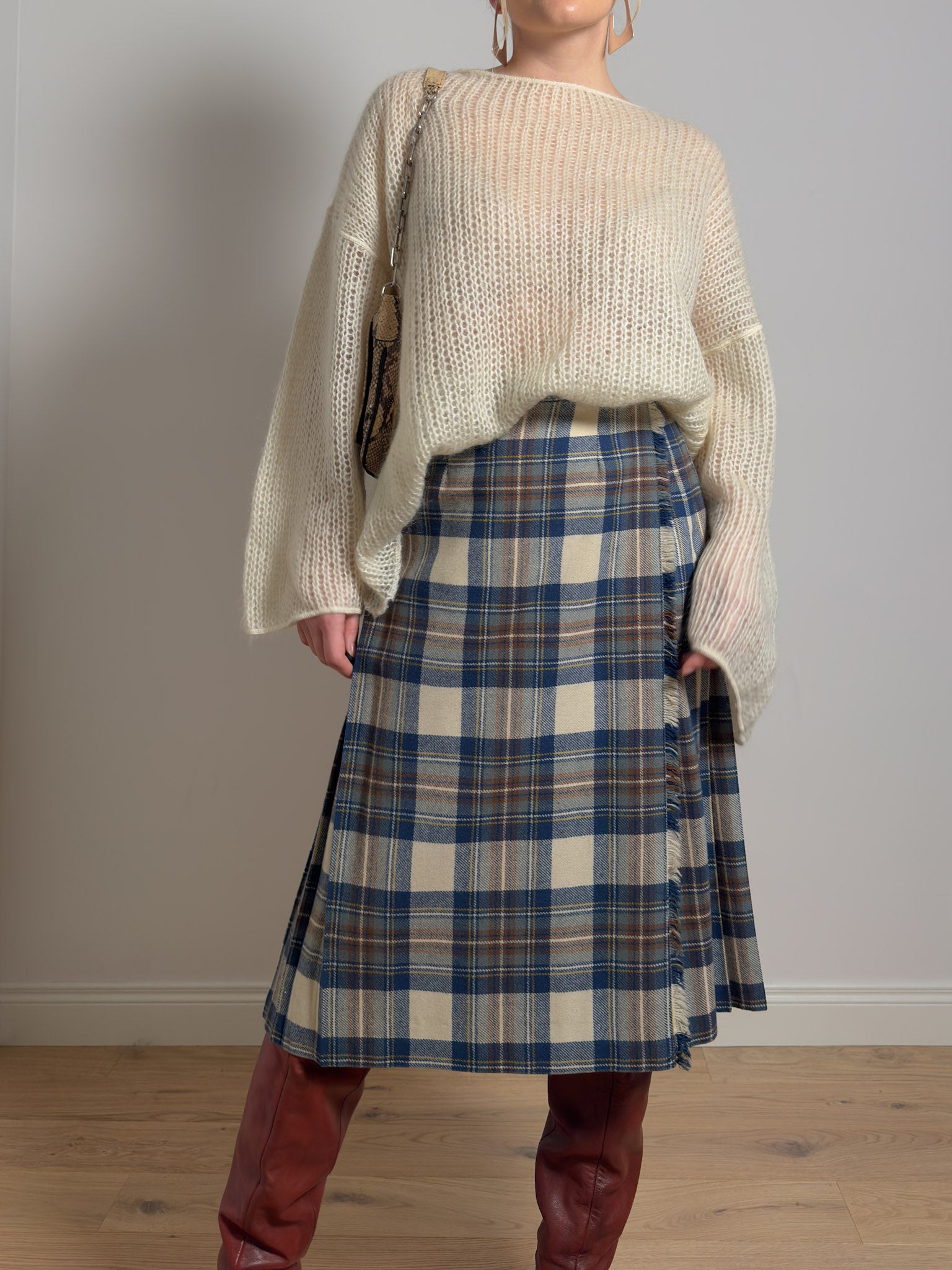 Gonna a pieghe vintage, Made in Scotland in pura lana vergine di alta qualità. La trama tartan si sviluppa in eleganti tonalità di blu, avorio e marrone, conferendo un look classico e senza tempo. Modello a portafoglio con chiusura laterale, perfetta per un tocco di stile raffinato e versatile. Ideale per chi cerca un capo iconico dal gusto tradizionale.
